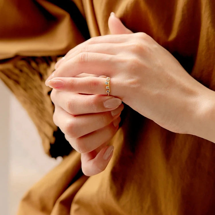 925 Sterling Silver 14K Gold Plated Blue Green Zircon Leaves Branches Ring
