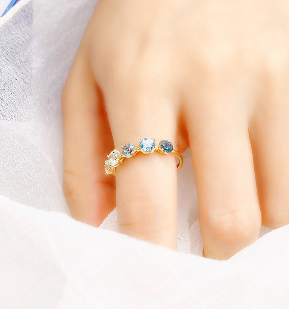 925 Sterling Silver 14K Gold Plated Gemstone Geometric Square Colourful Blue White Gradient Topaz Ring With Natural Stone