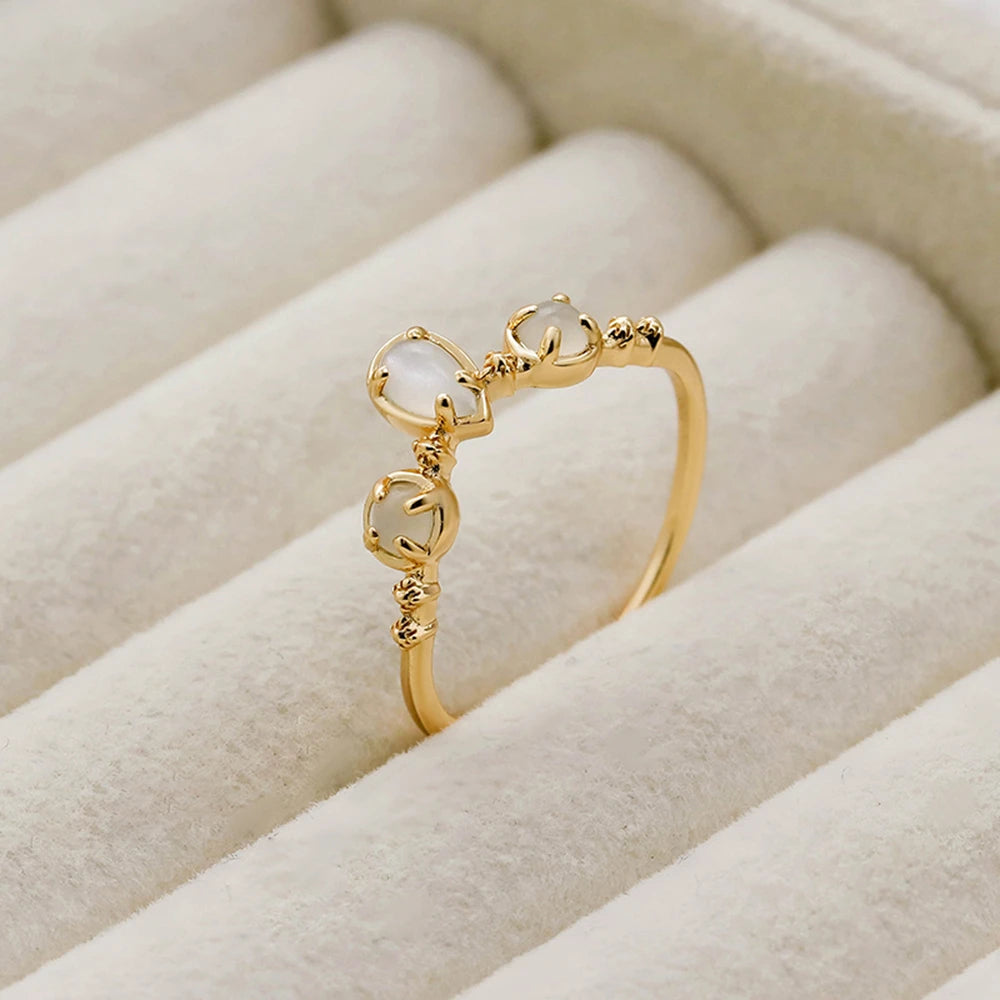 925 Sterling Silver 14K Gold Plated Gemstone Round Drop White Moonstone V Shaped Ring