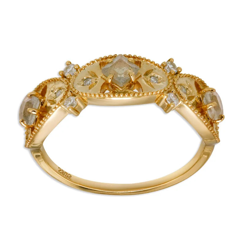 Bague Pour Femme Tendance 925 Sterling Silver Gold Plated Gemstone Retro Carved Cz Zircon Labradorite White Zirconium Ring