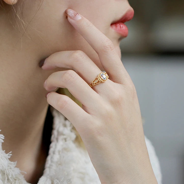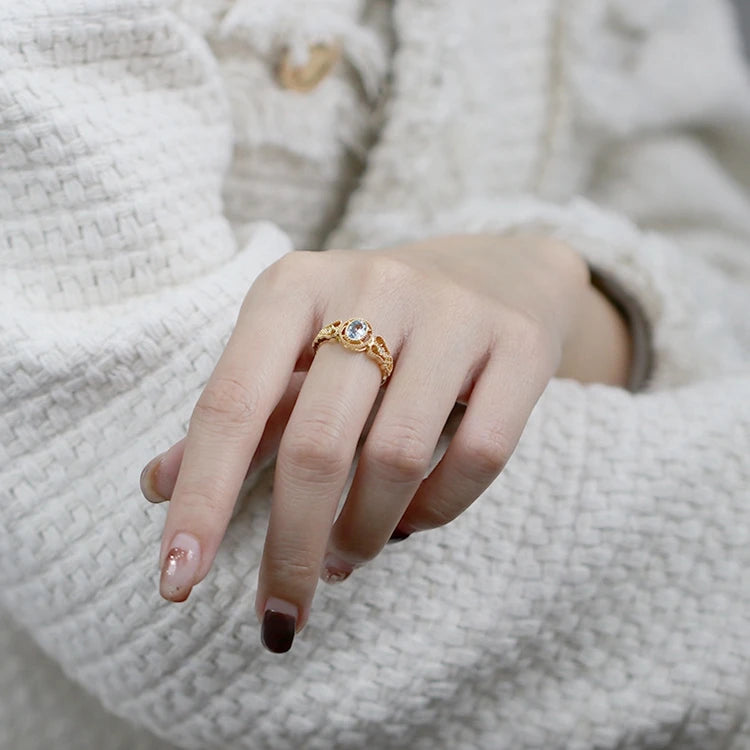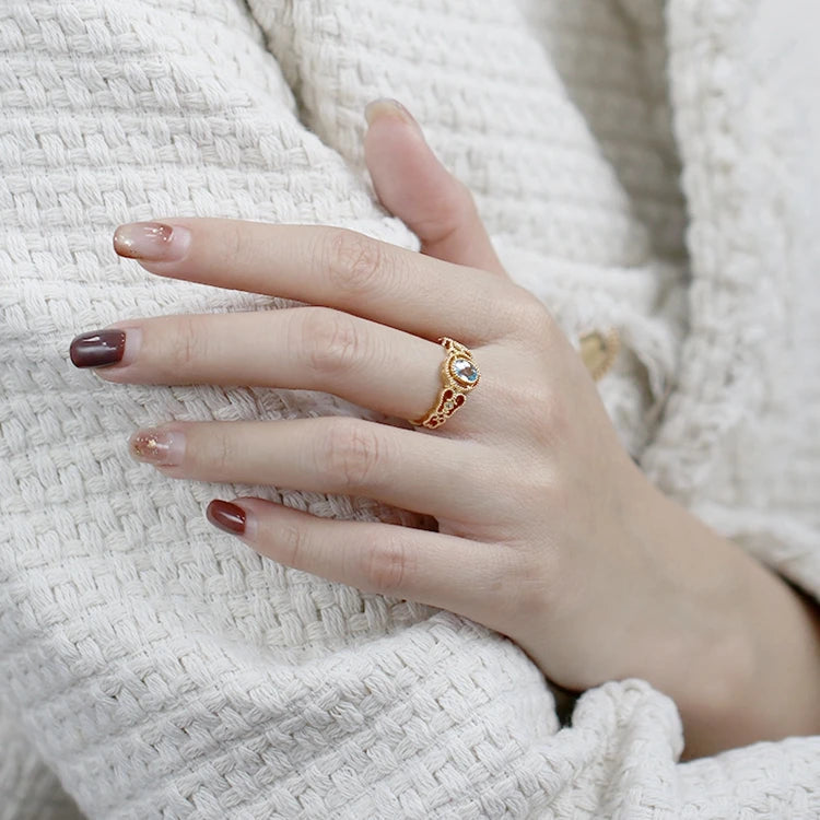 Emotional Factory 925 Sterling Silver 14K Gold Plated Gemstone Natural Blue Topaz Pattern Royal Style Ring
