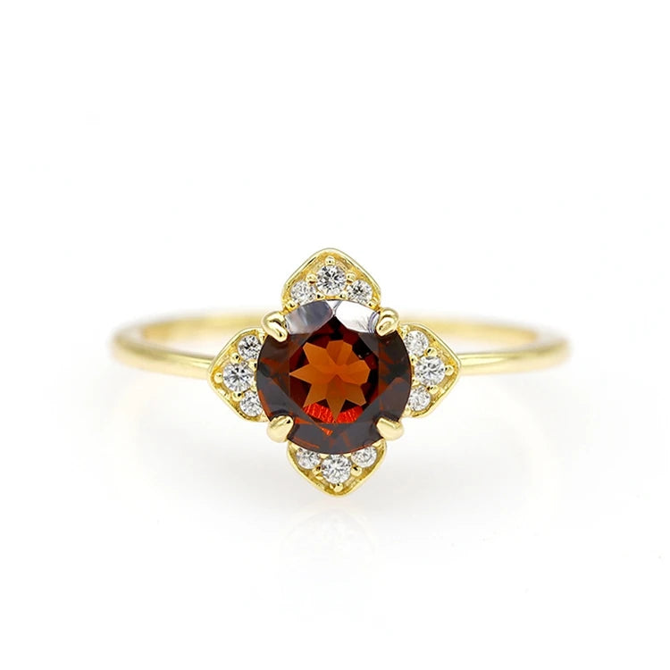 Emotional Factory 925 Sterling Silver 14K Gold Plated Gemstone Red Garnet Petal Shaped Cz Ring