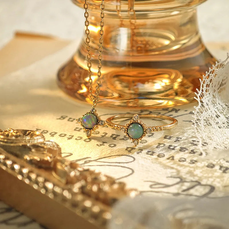 Emotional Factory 925 Sterling Silver 14K Gold Plated Gemstone Sun Sample Round Stone Vintage Fantasy Opal Ring