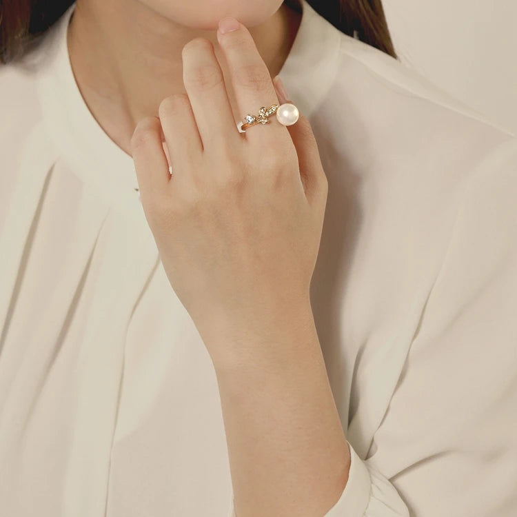 Emotional Factory 925 Sterling Silver 14K Gold Plated Gemstone Zircon Earrings Leaves Adjustable Pearl Ring