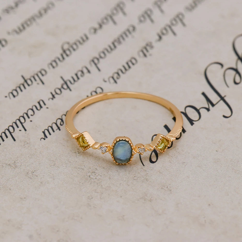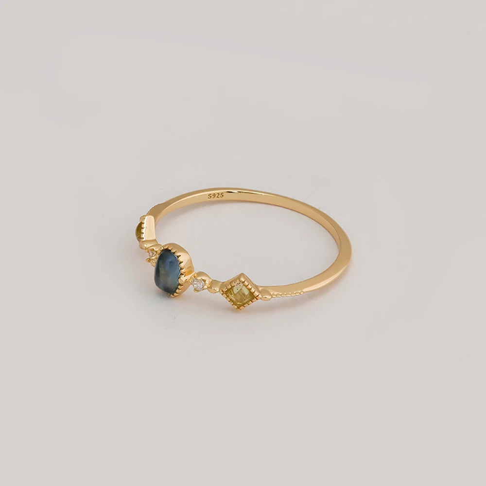 Emotional Factory Jewelry 925 Sterling Silver 14K Gold Plated Gemstone Series 3 Stone Rings Green Peridot Aquamarine Ring